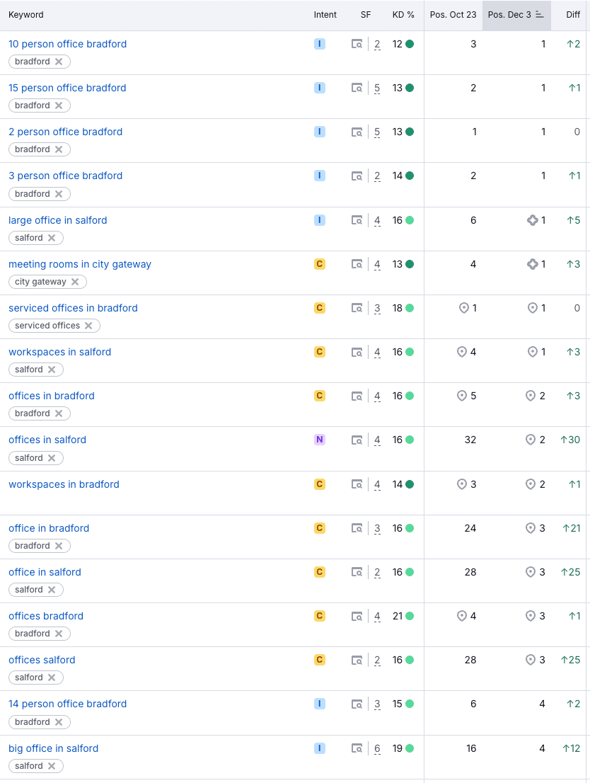 The focus was on targeting local search terms like โoffices to rent Bradfordโ and โoffices to rent Salford.โ Even though Hope Park offers more than just office rentals, these were the search terms potential customers were actually using, so it made sense to go after them.